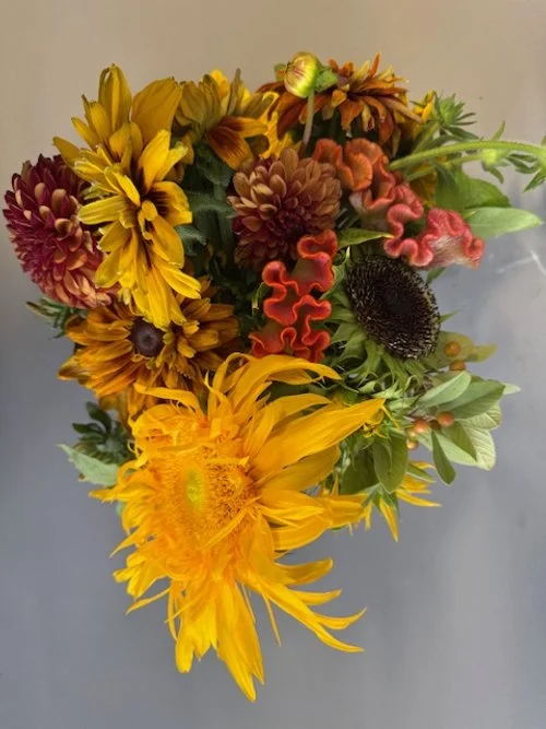 This arrangement features sun-drenched sunflowers, golden rudbeckia, velvety celosia, and rich seasonal blooms in warm amber and flame tones. Designed to capture the essence of late summer, birthdays, and joyful moments alike.